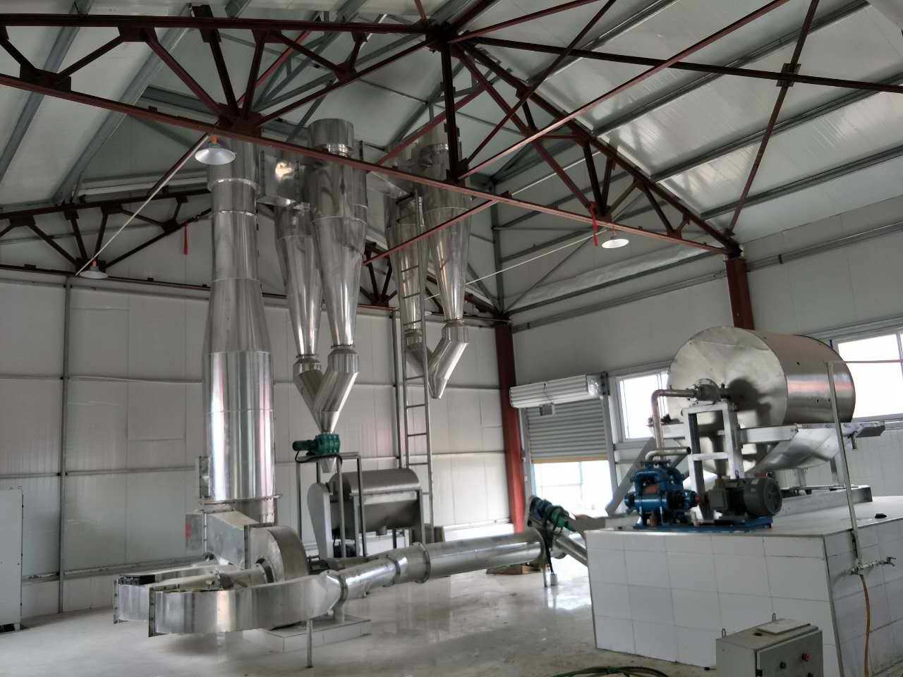 第三、熱風爐點火后,必須啟動烘干風機,使冷空氣冷卻爐壁,否則,會使爐壁過熱,損壞設備。當熱空氣溫度達到50~55℃時,啟動進料器電動機,開啟調速表,使物料緩慢進入干燥管,隨著熱空氣溫度的逐漸升高,(正常工作應保持在160℃左右)進料器的轉速要同步提高,至之到穩定生產。(以紅薯淀粉干燥為例,干燥器內的混合溫度應穩定在50~55℃之間。溫度升高,可提高進料器轉速,使進料量增加,反之應降低進料器轉速。)
